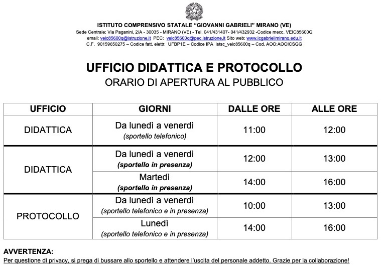 Per conoscere gli orari e le modalità di ricevimento contattare la segreteria scolastica