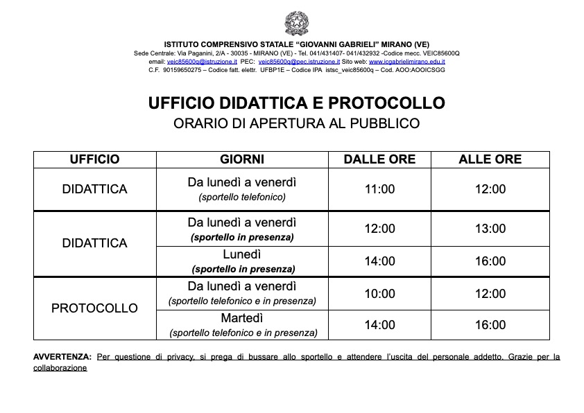 Per conoscere gli orari e le modalità di ricevimento contattare la segreteria scolastica